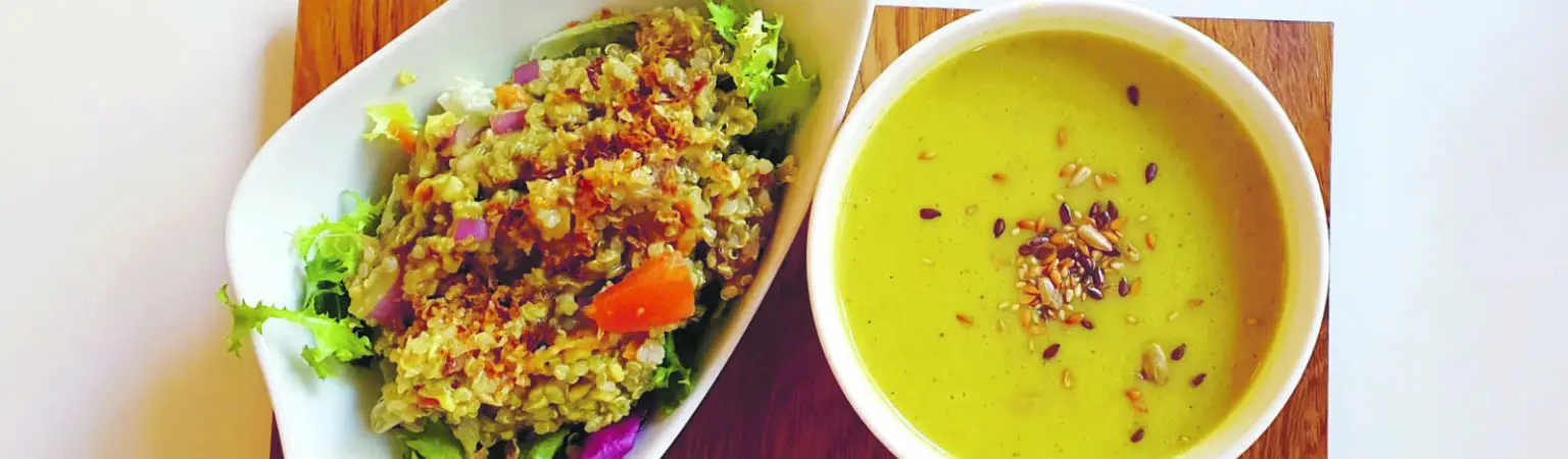 Destacan la hamburguesa vegetariana de Quorn, servida con crujientes gajos de patata, y el tartar de aguacate, combinado con tiras de boniato y remolacha de la freidora de aire caliente. Los que prefieran algo más ligero pueden disfrutar de un colorido poke bowl. Los amantes de los postres también tienen su hueco: una cremosa mousse de chocolate con helado de pistacho redondea a la perfección la experiencia de sabores. Todos los platos se sirven con atención al detalle: elegantes, pero no recargados.